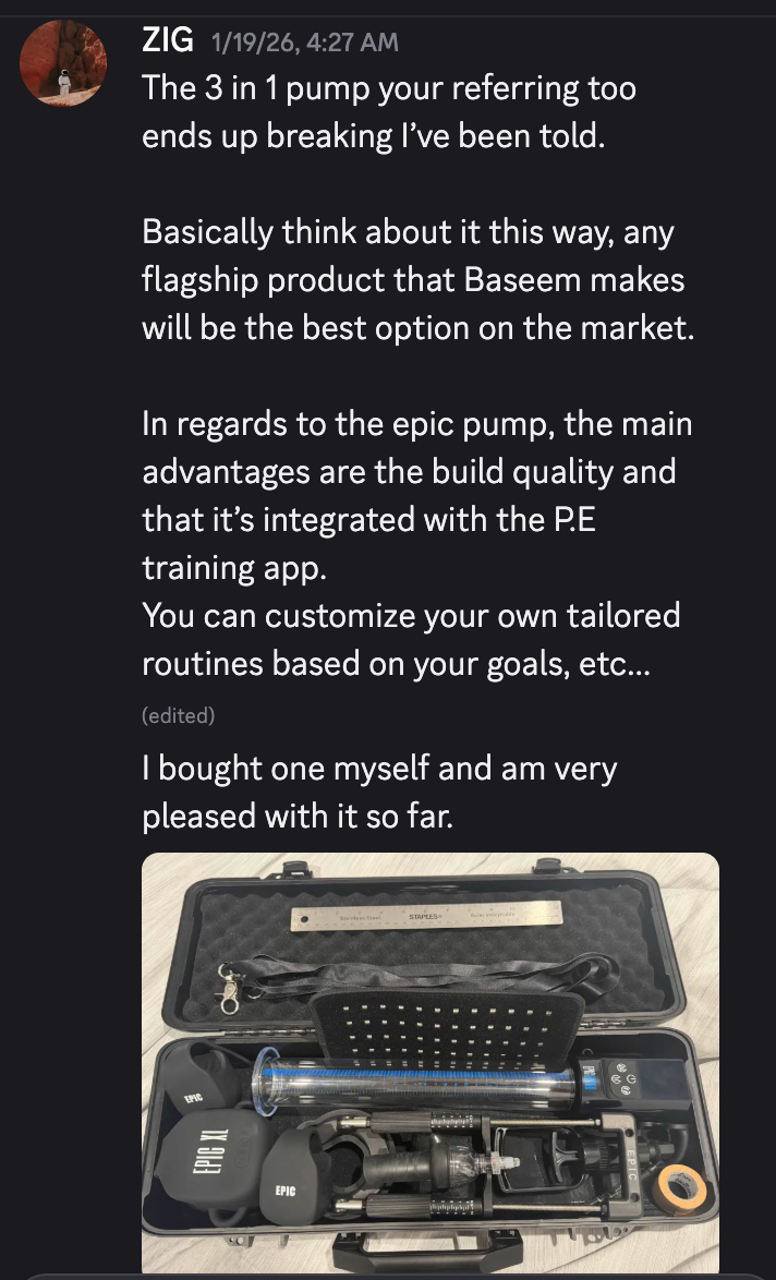 MOS in 2013. ThundersPlace right after. PE subreddits... over ten years deep. I've watched so many brands launch with hype and disappear within a year. Same Alibaba pump with a new logo and a Shopify store. Extenders that snap after a month. I've tried most of them. Spent over $5,000 easy. Started at 6.7 length and 5.1 girth. Now comfortably top 1%, maybe higher. Most of that progress came in the last two years using Baseem's stuff. First time I held the Epic bundle I could tell someone who actually does PE built this. The machining, the seal, the way everything fits together. Not corporate. Not rebranded junk. A guy who lives this designing what he wished existed a decade ago. I've seen everything come and go. This stays. Kudos to Baseem!