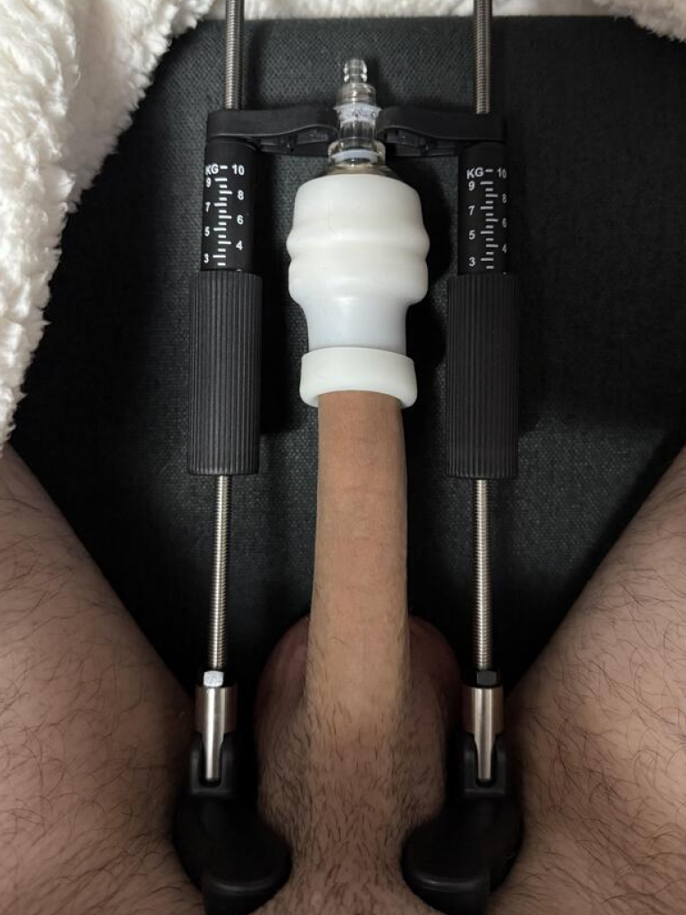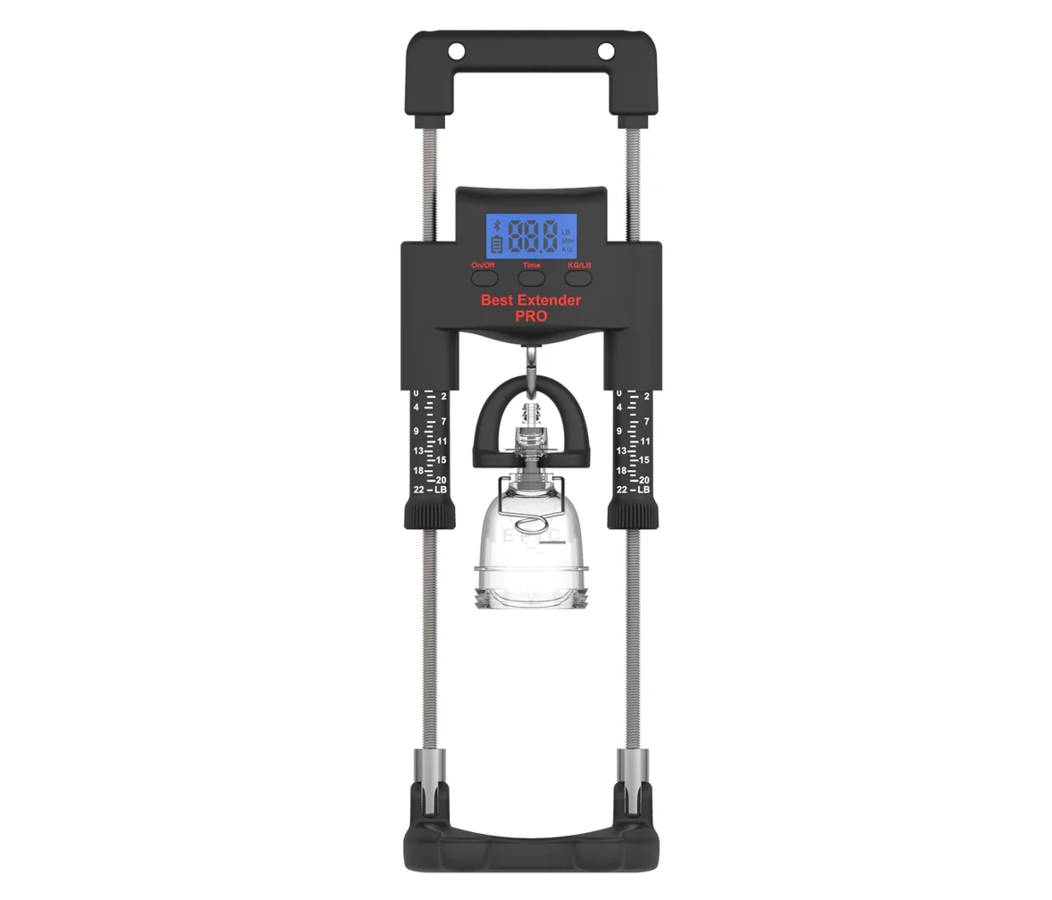 Extender device with digital tension scale, padded silicone base, adjustable straps, PeniMaster cup adapter